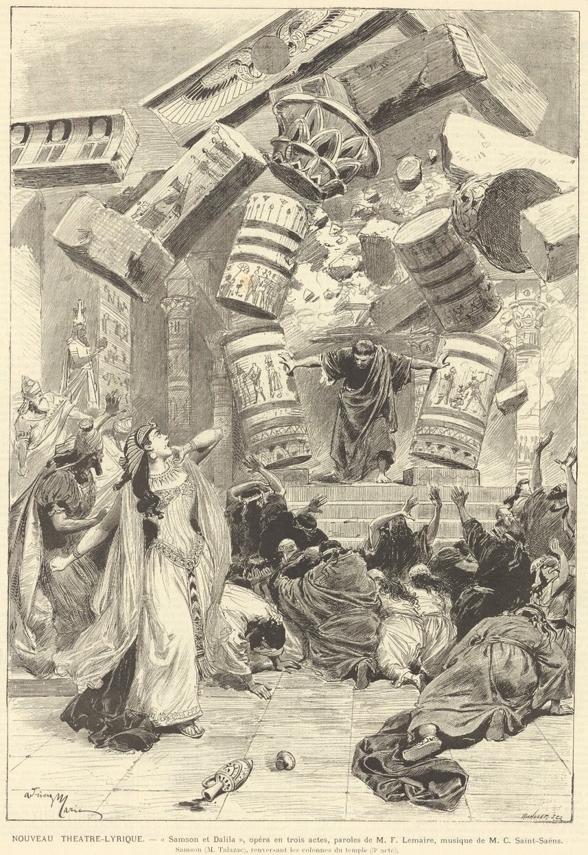 Certes, Bruneau n’évalue pas l’opéra entier dans une telle perspective. L’intensité du duo d’amour entre les deux protagonistes au deuxième acte et l’effet d’écroulement des murs du temple de Dagon à la fin de Samson et Dalila (Image 1) ne suscitent pas une opinion si réductrice. Mais reconnaissons aussi que des longueurs se faisaient sentir suffisamment pour avoir laissé des traces dans la réception de l’œuvre. L’avis de Bruneau fut partagé par d’autres critiques au moment de la création parisienne et il n’a pas complètement disparu de la réception actuelle de l’opéra non plus.