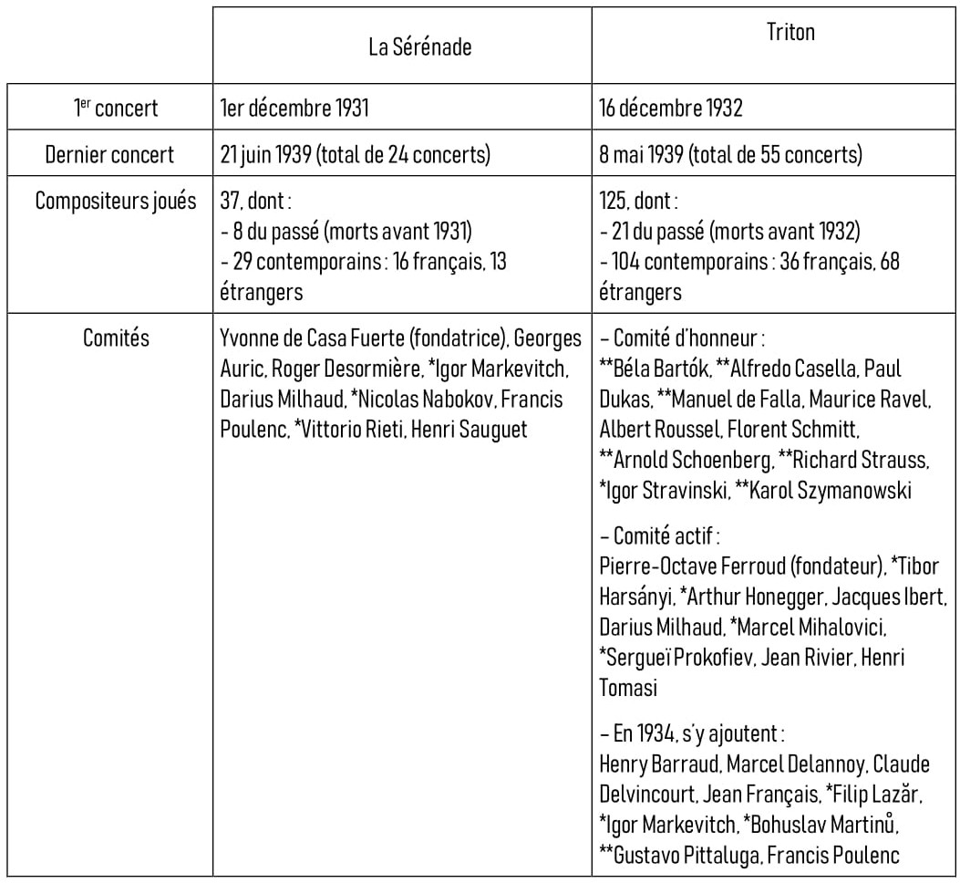 Il n’est pas impossible que le choix d’un triton comme symbole suggère une filiation avec La Sirène musicale, maison d’édition très active dans la publication et la promotion de la musique des jeunes compositeurs français et étrangers actifs à Paris. À partir de 1929, La Sirène musicale organise quelques concerts dont les caractéristiques ressemblent beaucoup à celles du futur Triton : promotion des jeunes compositeurs sans égard à leur passeport, une certaine prédilection pour un langage musical avancé s’inscrivant dans des formes traditionnelles (trio, quatuor, sonate), prévalence de la musique instrumentale sur la musique vocale (les deux tiers des œuvres, ce qui contraste avec La Sérénade, où les pièces vocales étaient prédominantes). Le tableau 1 propose une comparaison des quelques données relatives à La Sérénade et au Triton.