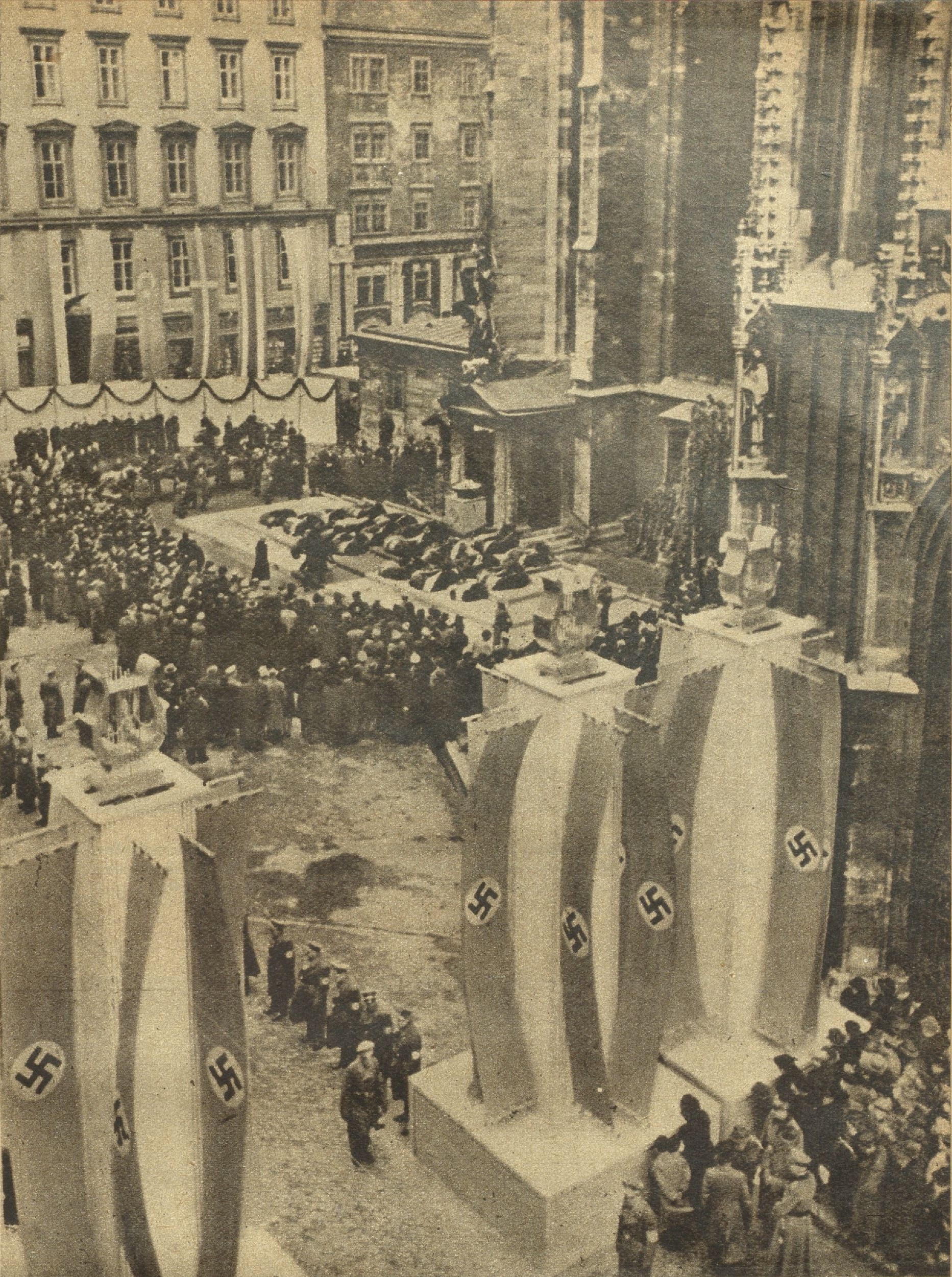 C’est précisément en raison de son « universalité » que Mozart est considéré par la majorité des auteurs comme une figure de réconciliation. «Dans cet enthousiasme collectif, il n’y avait alors ni frères mineurs, ni parents pauvres, ni vaincus, ni humiliés, mais seulement des hommes tournés vers un avenir de paix », écrit Genin à propos de la cérémonie officielle du 5 décembre (Genin 1941, p. 3). Organisée sur le flanc nord de la cathédrale Saint-Stéphane – qui a accueilli en 1791 les derniers sacrements du compositeur –, cette cérémonie réunit tous les représentants des nations invitées dans le cadre d’une grand-messe nazie en mémoire de Mozart (Figure 2). Elle est suivie d’une monumentale exécution du Requiem par Wilhelm Furtwängler dans la grande salle du Musikverein ; le tout est conçu et perçu comme l’apothéose d’une semaine exceptionnelle.